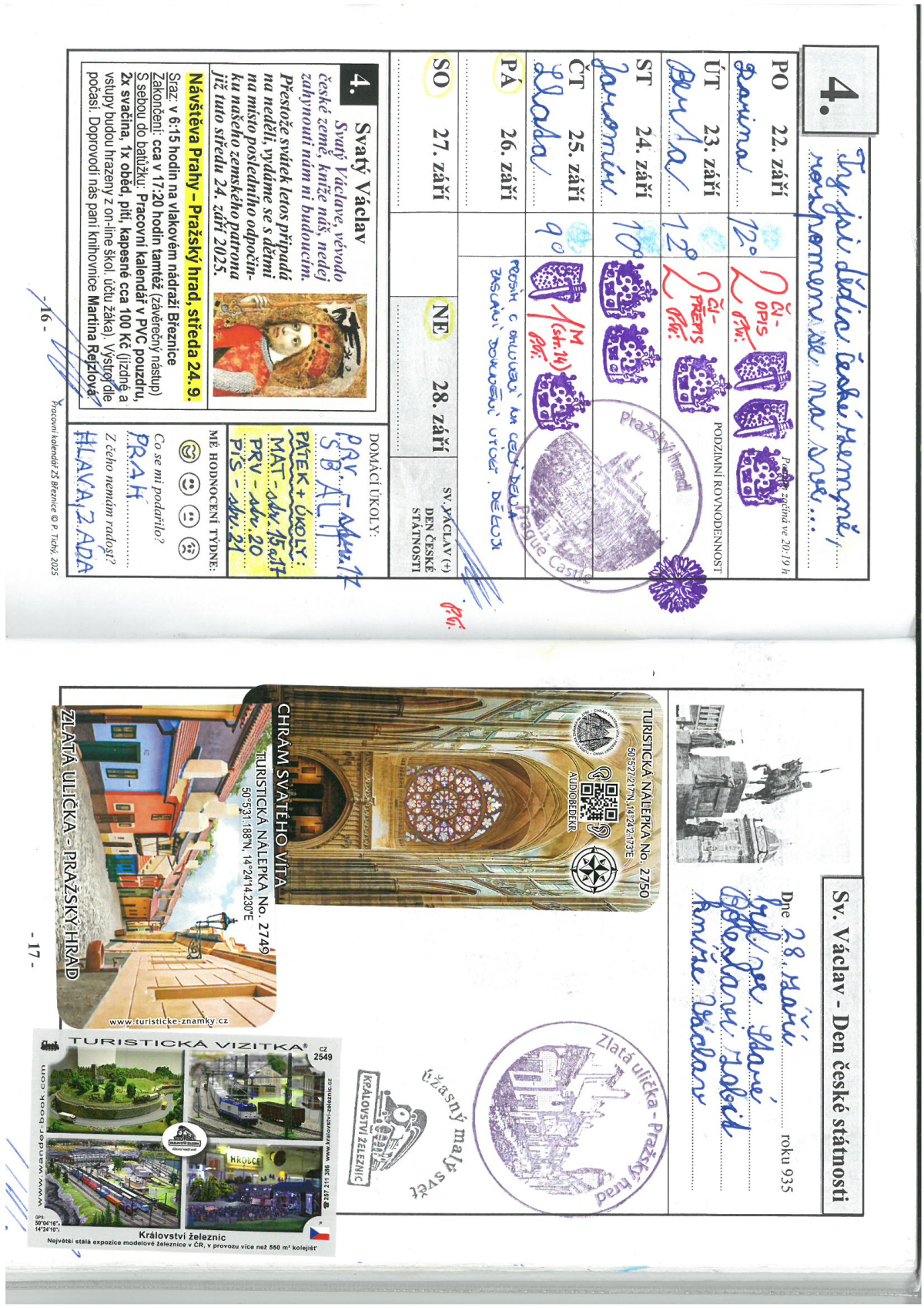 V neposlední řadě si děti v příslušném řádku kalendária denně odnášejí od paní učitelky nebo pana učitele nějakou známku nebo hodnotící razítko. Protože jsou postupně do kalendáře vlepovány i fotografie ze života třídy, stává se z těchto deníků (jež nahrazují prvoučnou cvičebnici, úkolníček i žákovskou knížku) ucelená kronika školního roku. Ta po jeho ukončení zůstává každému žákovi jako vzpomínka na školní začátky.
