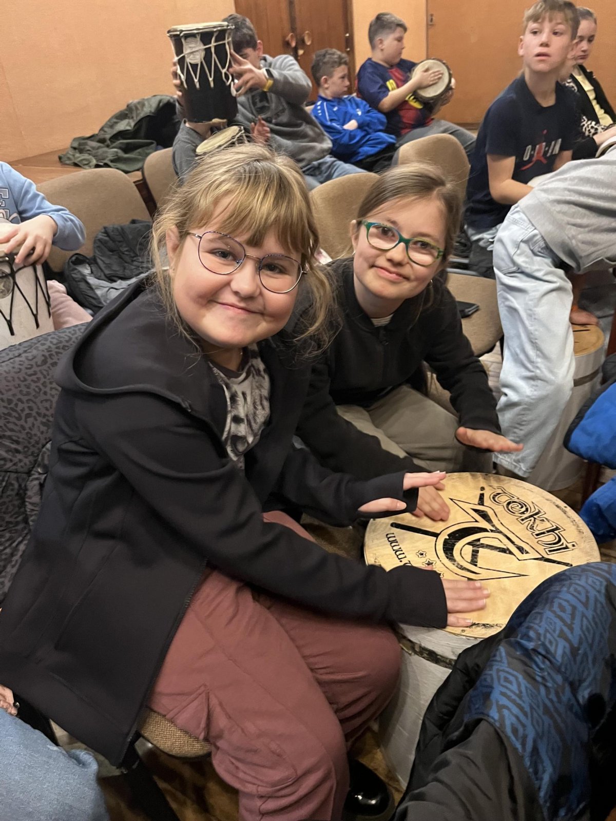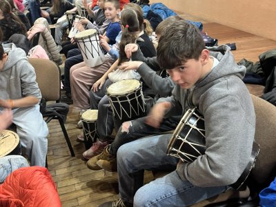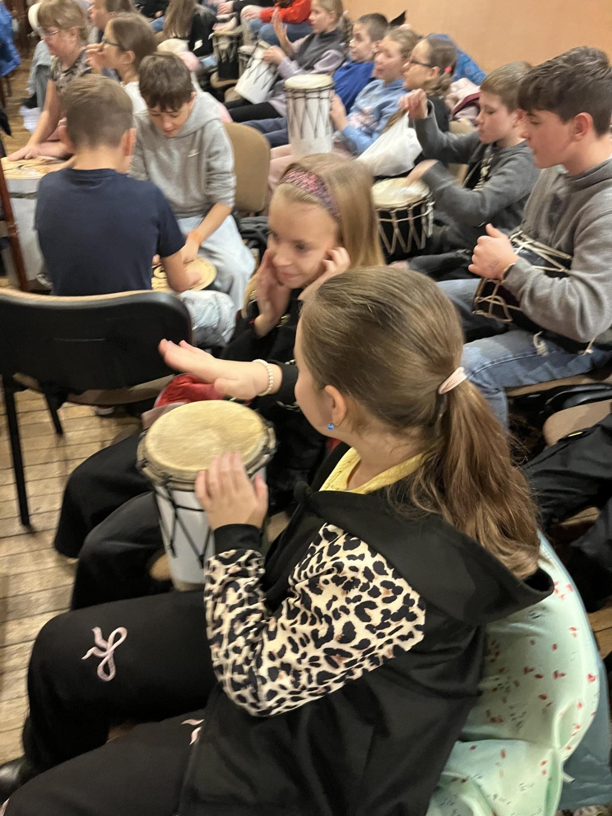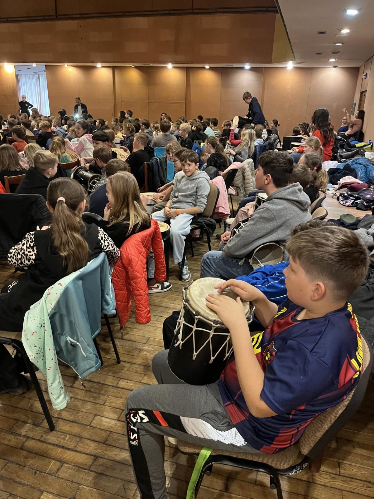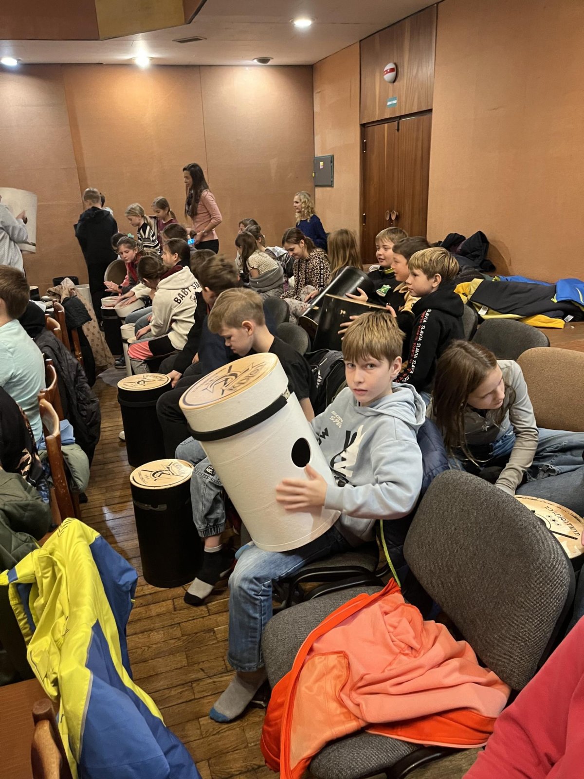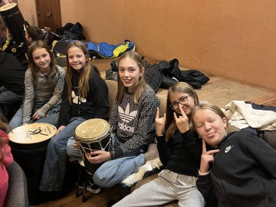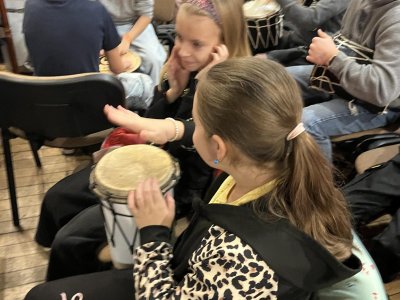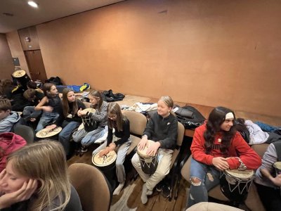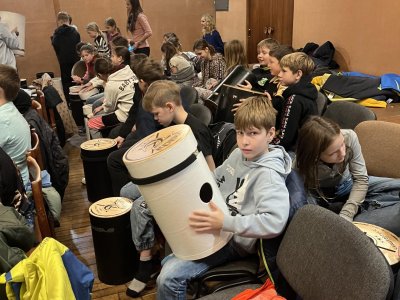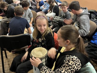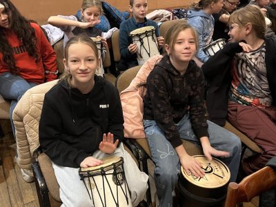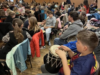 Hudebního projekt pod vedením Tokhiho, kde žáci hráli na bubny i Boomwhackers.