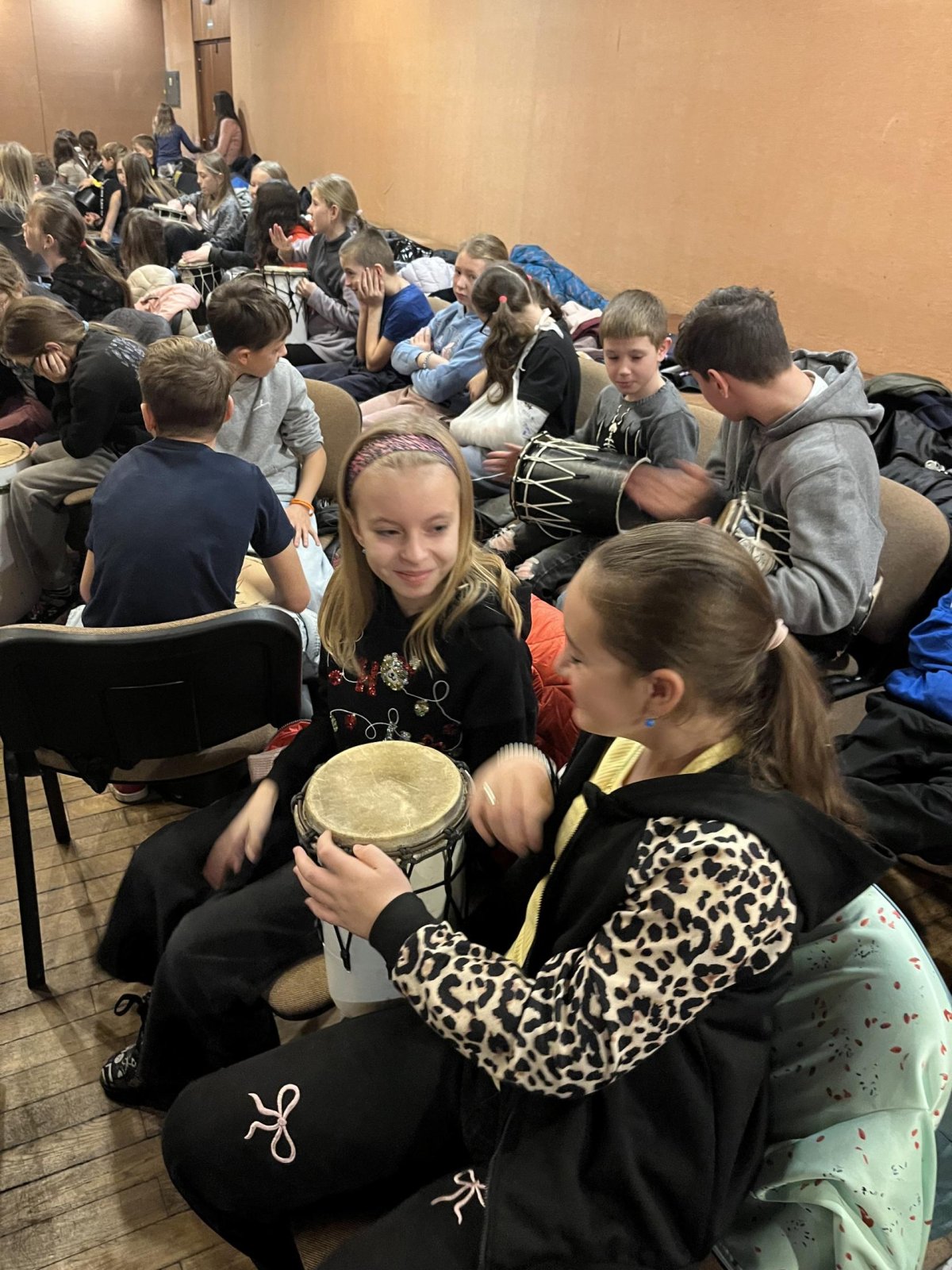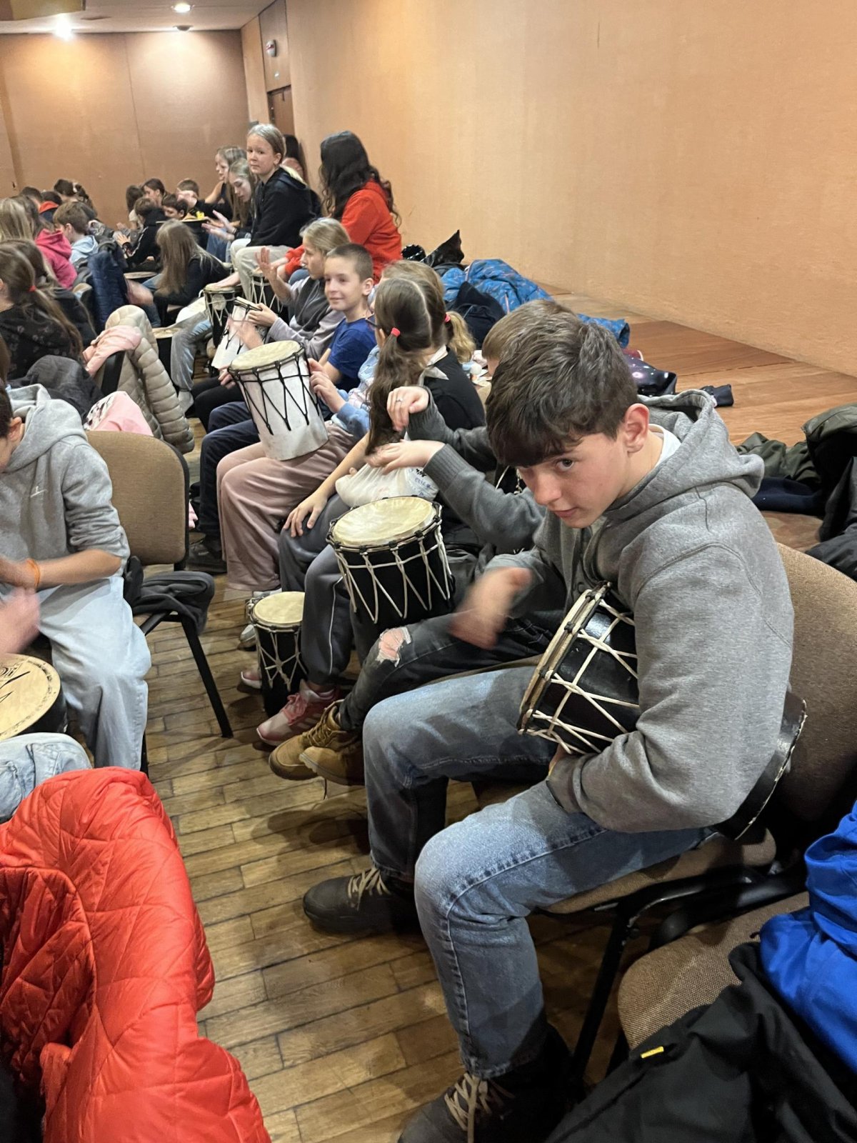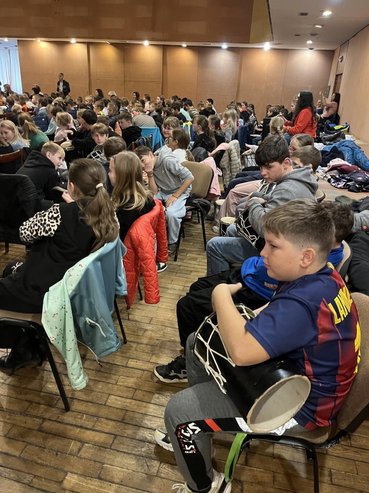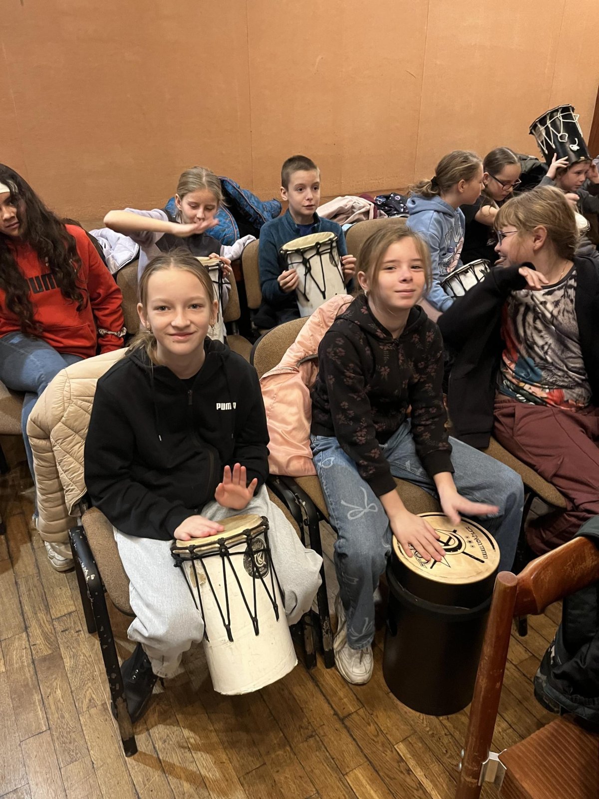 Hudebního projekt pod vedením Tokhiho, kde žáci hráli na bubny i Boomwhackers.