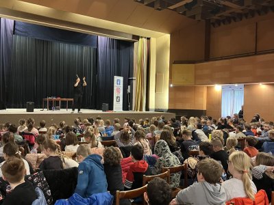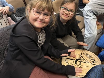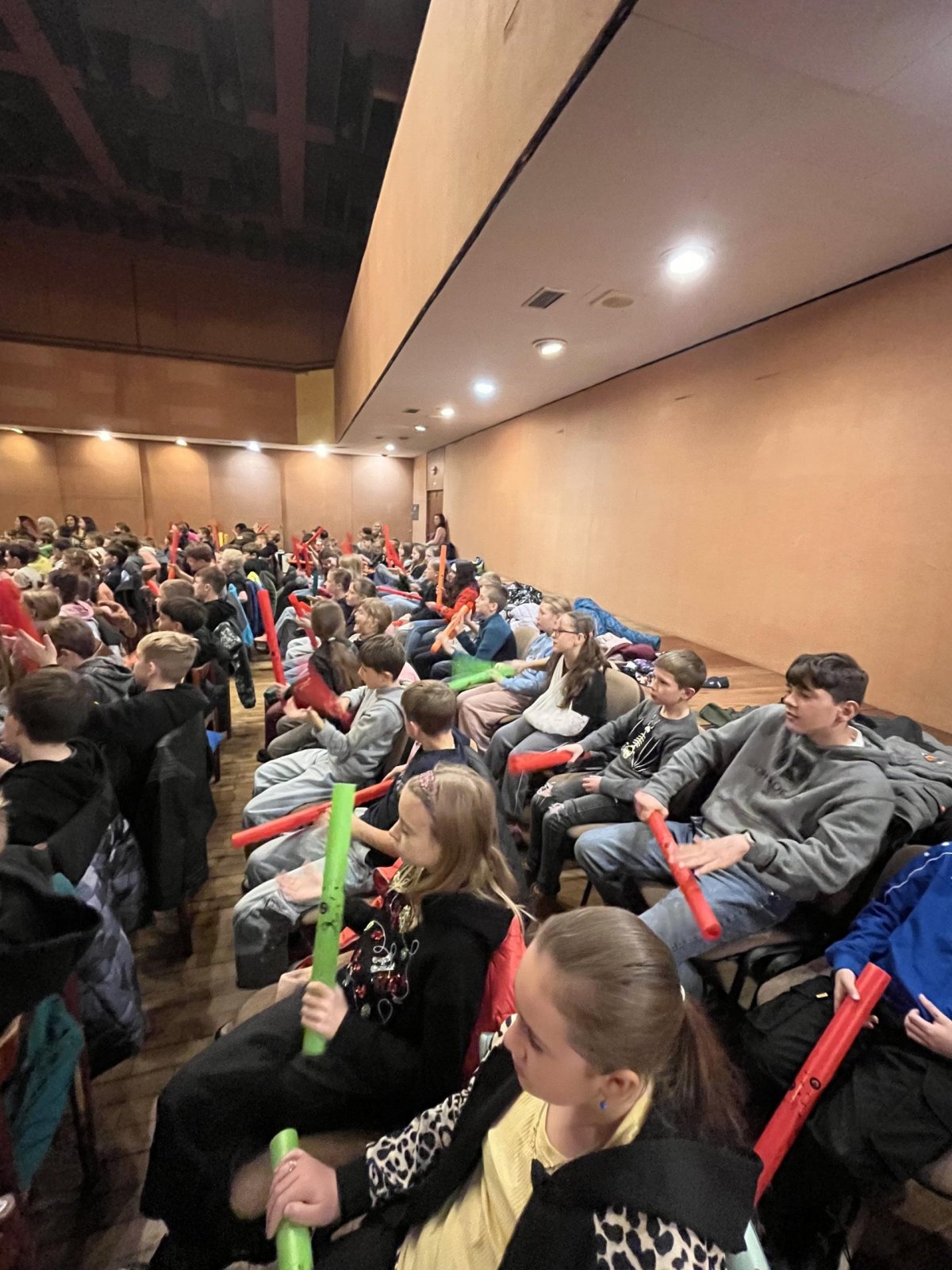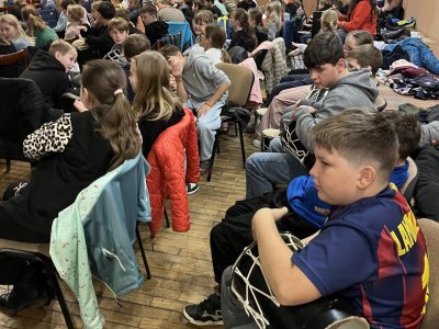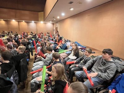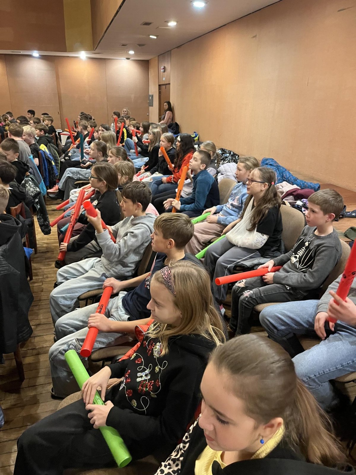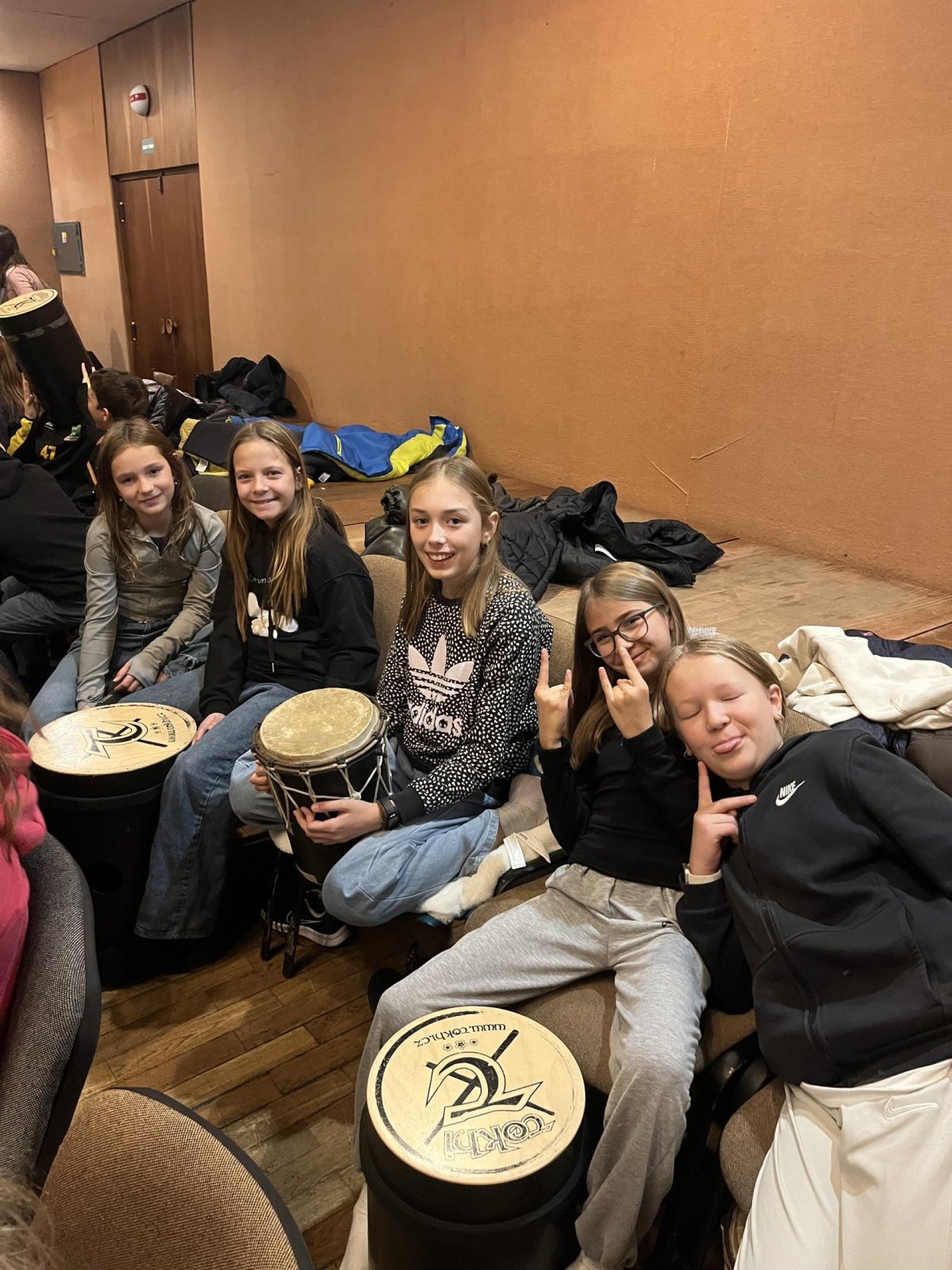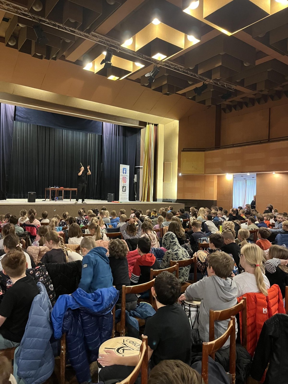 Hudebního projekt pod vedením Tokhiho, kde žáci hráli na bubny i Boomwhackers.