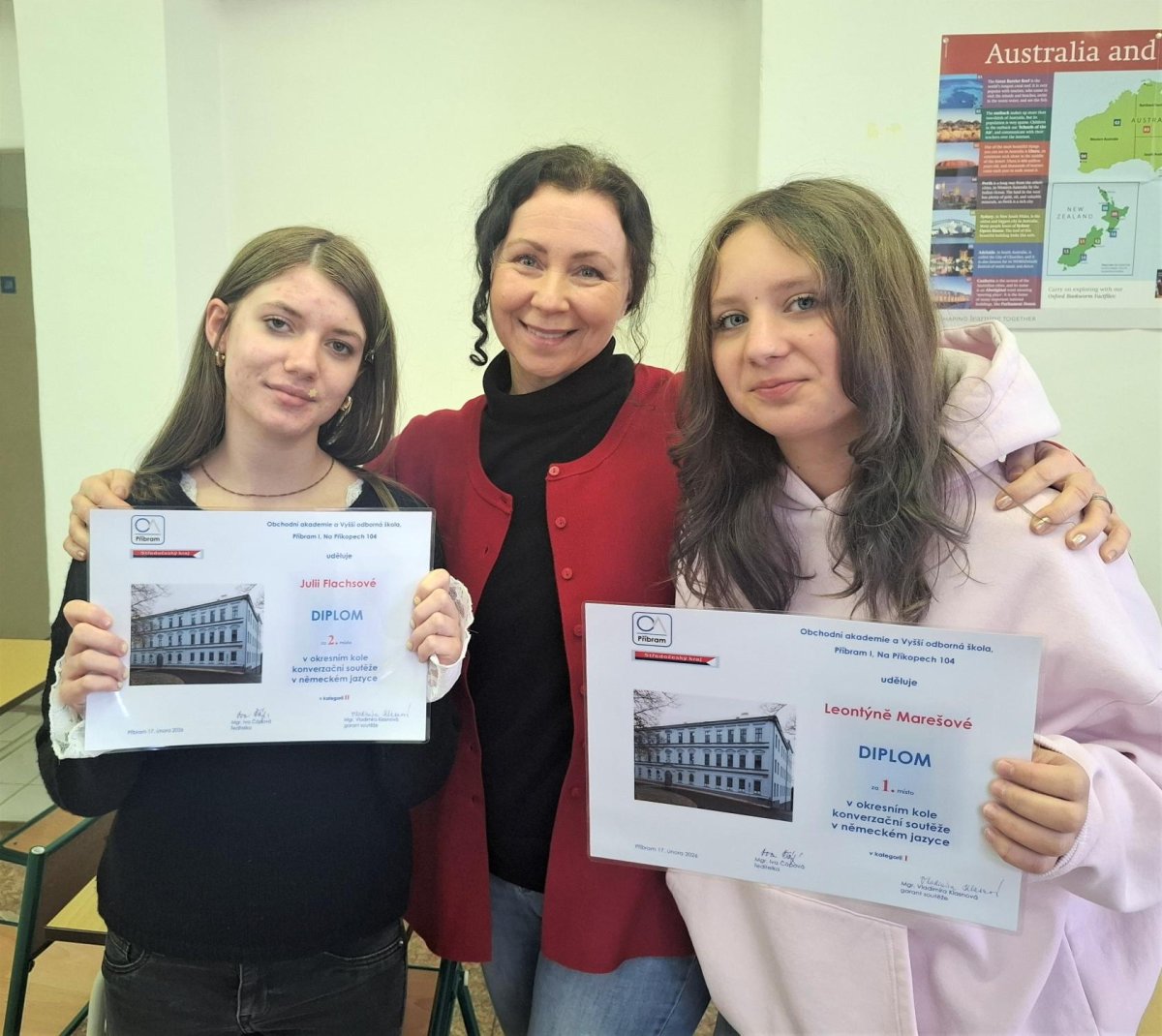 V úterý dne 17. 2. 2026 se v Příbrami na Obchodní akademii konalo okresní kolo v konverzační soutěži v německém jazyce. Naši školu reprezentovaly žákyně Leontýna Marešová a Julie Flachsová. Soutěž se skládala z poslechového cvičení, popisu obrázku a rozhovoru před komisí na různá konverzační témata. Děvčata soutěžila ve stejné kategorii se studenty z víceletých gymnázií a přesto Leontýna vyhrála 1. místo a postupuje do krajského kola. Julie se umístila na krásném 2. místě. Blahopřejeme a děkujeme za skvělou reprezentaci naší školy.