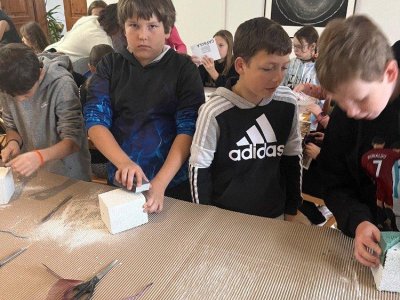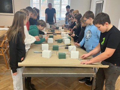 V průběhu listopadu navštívila naše třída Galerii Františka Drtikola. Po teoretickém úvodu vytvářela jedna skupinka koláž z fotografií, druhá dílna navazovala na tvorbu Jakuba Grece. Děti pracovaly s materiálem Ytong, vyzkoušely si hledání tvaru a vytváření vlastní sochy.