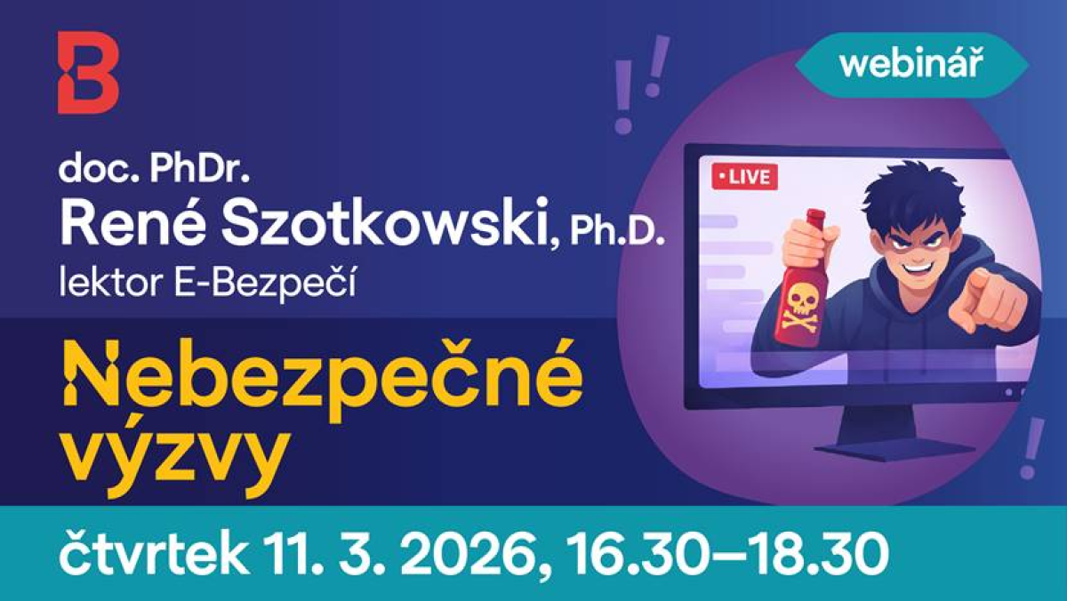 Sdílíme nabídku platformy E- Bezpečí k účasti na webináři NEBEZPEČNÉ VÝZVY. Konání ve středu 11. 3. 2026, 16.30 – 18:30 hod, lektor E-Bezpečí Doc. René Szotkowski.