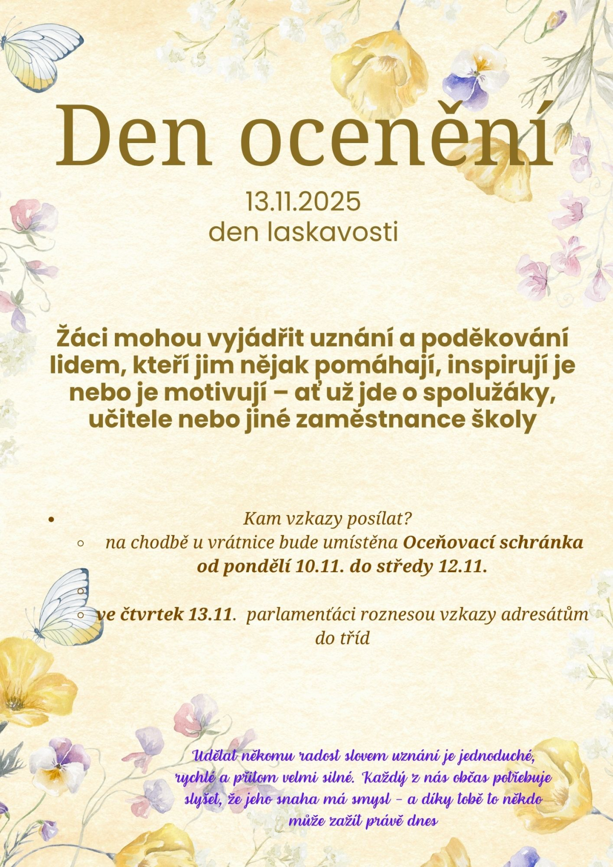 Ve čtrtek 13.11.2025 se u nás na škole bude roznášet "laskavá pošta". V dopisech mohou žáci ocenit své spolužáky, učitele nebo jiné zaměstnance školy za to, že jim pomáhají, inspirují je nebo je motivují.