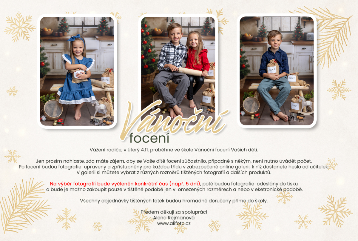 podobně jako v loňském roce škola nabízí vánoční focení, které proběhne 4. 11. 2025. Více informací na přiloženém plakátu. Zapisování k focení bude probíhat přes anketu v bakaláři od 20. října.